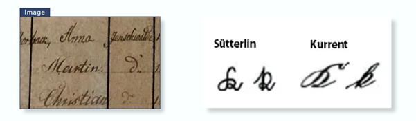 The documents used for reserach in the church at Jänschwalde use a difficult to read form of Sütterlin, a German script (style of writing) shown with a comparison to ‘Old German Script’ called ‘kurrent’. The ‘K’ ending the name Schorback, can be clearly seen in this example.